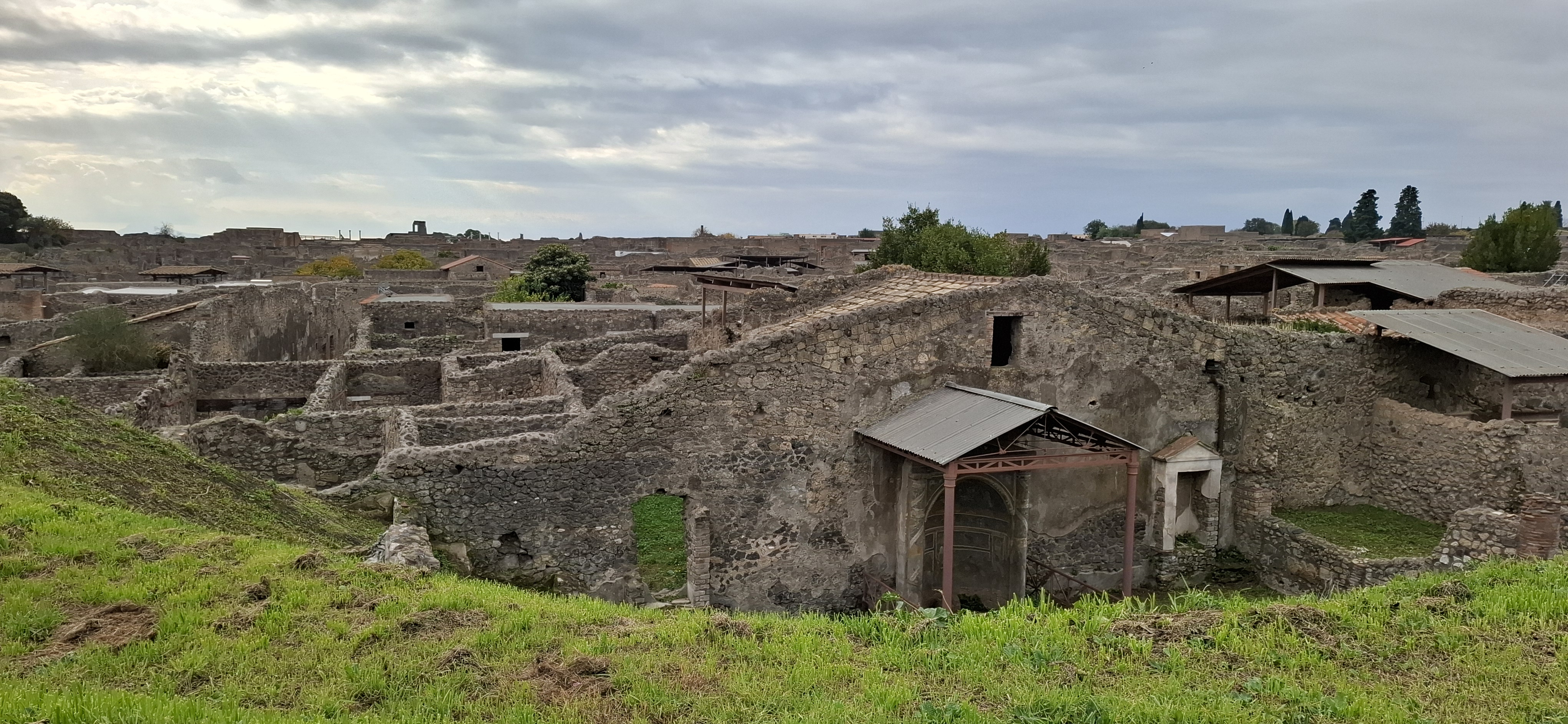 Here two stops were of fundamental interest for our research: the top of the hill of regio IX of the recently restored late 18th-century Casina dell'Aquila, and the ongoing construction site of the new adjacent excavations thanks to the raised walkways recently made accessible to the public. From the Casina it is possible to get a clear view of the ground level and a view of the ancient city below with the Lattari mountains in the background, while from the open building site we were able to observe live, as if we were back in the 18th century, the workers removing the lapilli and pumice with shovel and wheelbarrow, bringing to light the remains of a dwelling.
