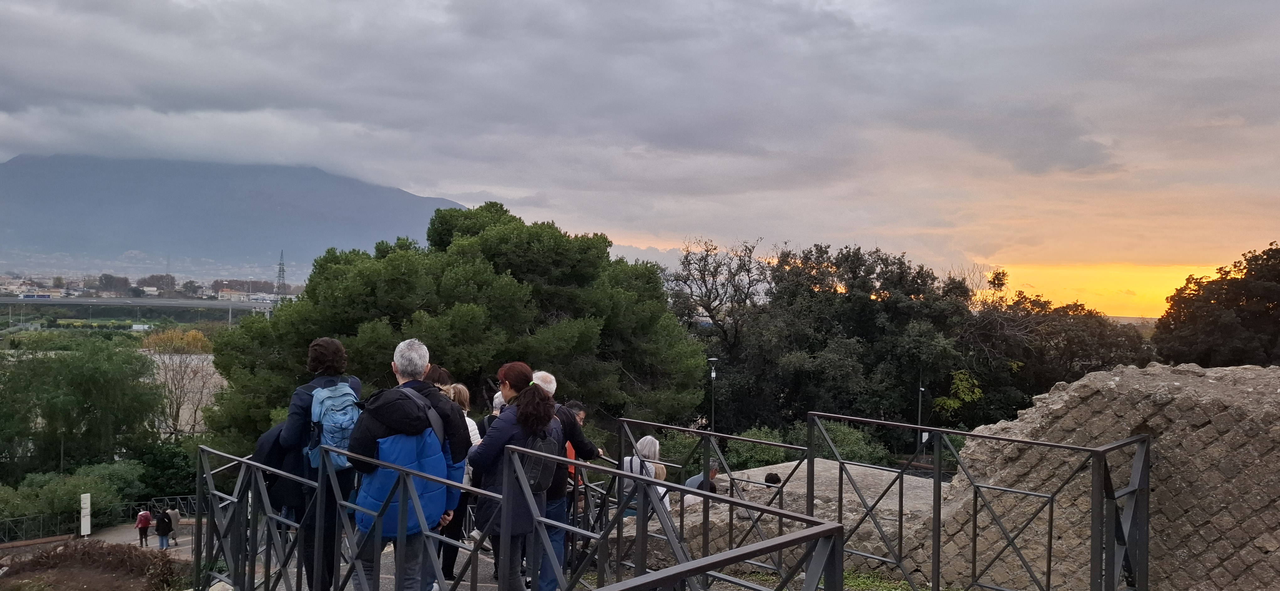 Our tour started from Porta Marina, walking along the left side of the Suburban Baths up to the prehistoric lava plateau about 40 m high overlooking the mouth of the Sarno River, which was navigable at the time, on top of which the city stands. We continued through the Forum with the Temple of Jupiter on its high podium and then headed northwest to the Porta Ercolano, with a stop at the Casa del Fauno, with millstones and an oven. Leaving the city we observed the walls, visited the necropolis along the extra-urban part of the route and the suburban villa of Diomede, on a terrace overlooking the porticoed garden below, and that of the Misteri, on a sea-view base leaning against the steep slope. It was on this side that the first 18th-century Bourbon excavations were begun.